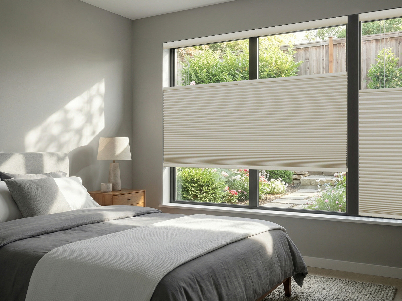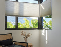 Adjust these honeycomb shades to let in morning sun while keeping your lower window covered for privacy.